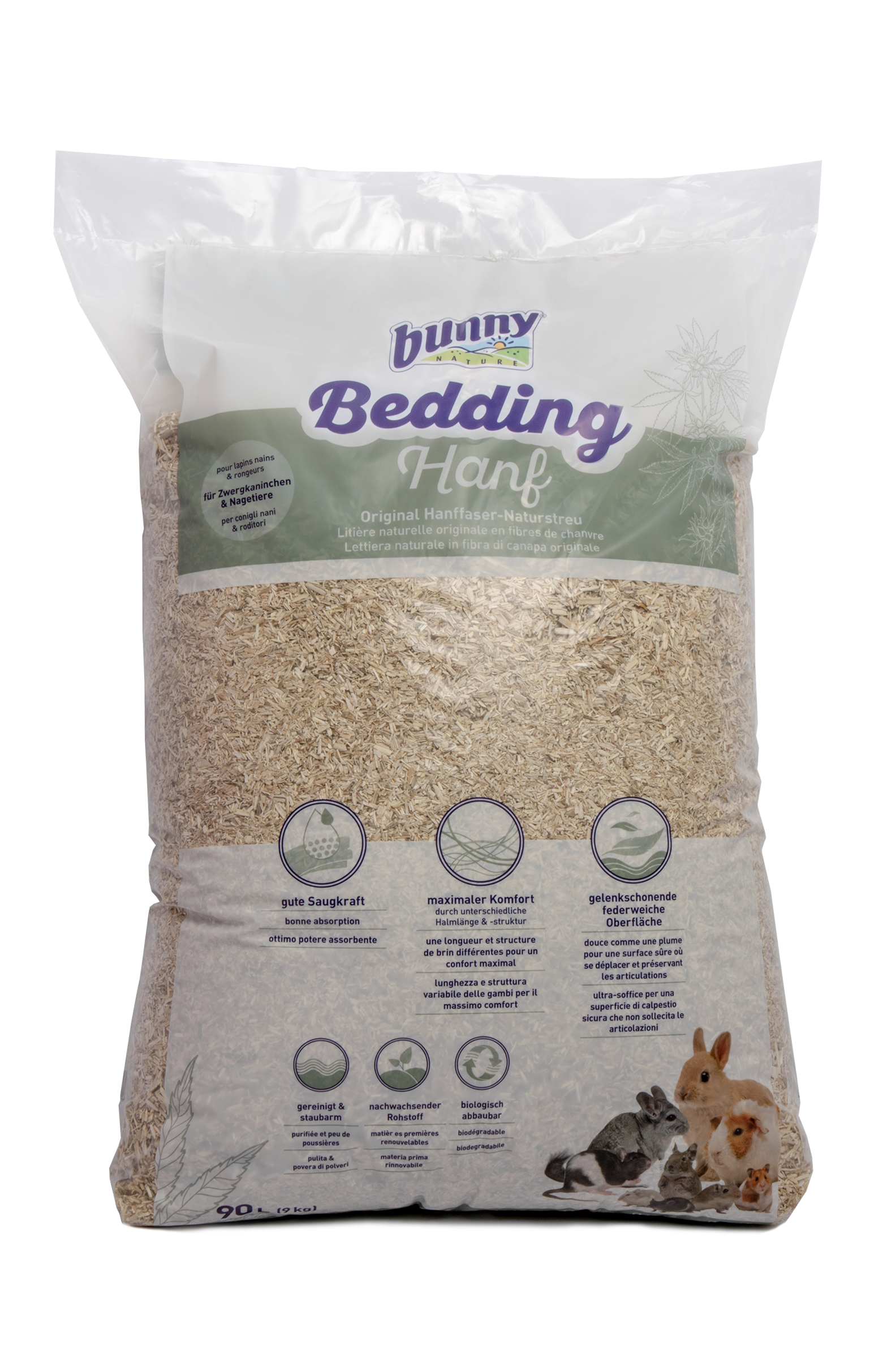 Hemp fiber is a traditional and fast-growing crop. A loose layer bunnyBedding Hemp offers sensitive animals in particular a dry, pleasantly soft and springy surface to run and lie on. It is particularly economical, kind to the fur and gentle on the skin.