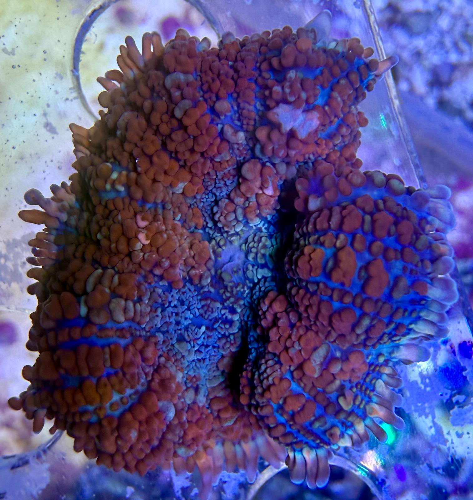 Die Rhodactis „Forest Fire“ ist eine robuste und pflegeleichte Scheibenanemone, die sich gut für Einsteiger und gemischte Riffaquarien eignet. Sie bevorzugt stabile Wasserwerte und eine geschützte Position im unteren bis mittleren Riffbereich. Zu starke Beleuchtung oder direkte Strömung sollte vermieden werden, um eine optimale Expansion und Farbentwicklung zu gewährleisten.