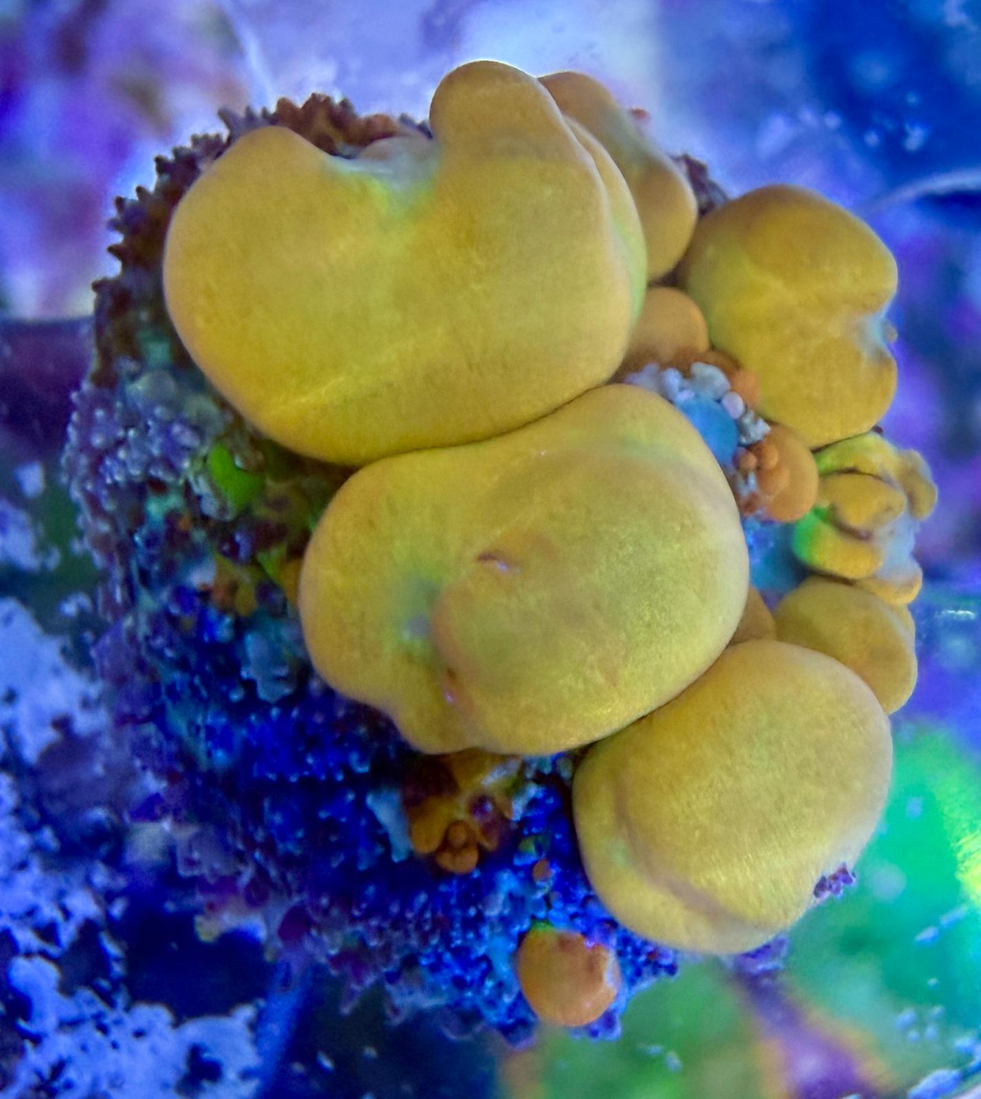 Farbe: Leuchtend grüner Grundton mit ausgeprägten, kugelförmigen „Bounce“-Bläschen in Gelb- bis Orangetönen; starke Fluoreszenz unter Blaulicht
