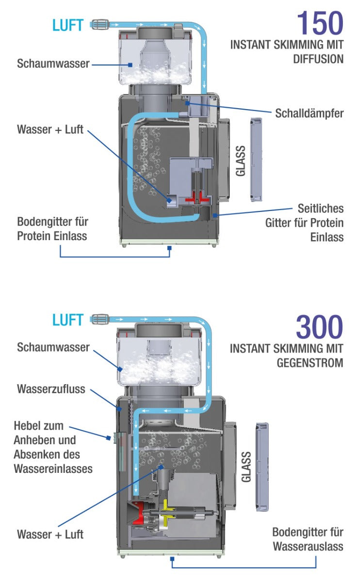 Gegenstrom- Abschäumung mit verstellbarem Wassereingang. |