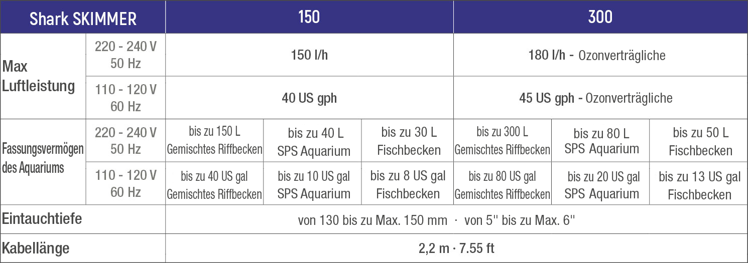 Shark SKIMMER 150 und Shark SKIMMER 300 sind moderne Innenabschäumer mit sehr kompaktem und innovativem Shark- Design, für eine direkte Platzierung in einem Meerwasserbiotop. Sie basieren auf den neuesten Entwicklungen und Kenntnissen im Bereich Riffaquaristik und sind je nach Beckenbelastung für Aquarien bis 150 und bis 300 Liter ausgelegt. Ihr sehr geringer Energieverbrauch stellt sie an der Spitze am Markt für diese Schäumleistung. Sie sind extrem leise, einfach zu bedienen und leicht auseinander zu bauen.